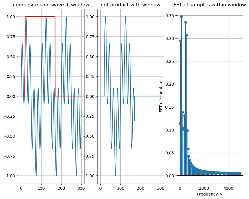 Consider the following example. We have again considered a composite signal from above but the signal is of longer duration. In the first image we have applied a rectangular window to the signal. Then we calculated FFT for the portion of signal where window was applied. Look how the spectrum gets distorted. This is because of the abrupt termination at the edges of the rectangular window.