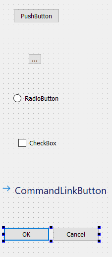 Buttons: The figure below shows six button-widgets those are push button, tool button, radio button, check box, command line button, dialogue box button.
