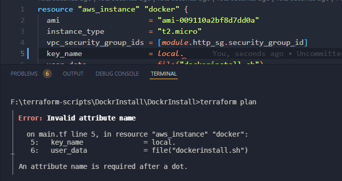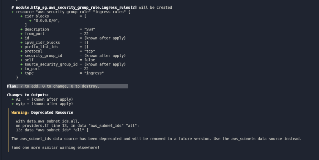 These are all answered in the terraform plan command’s output. Observe the images. It’s a blueprint of sorts, if your design has error syntactical or otherwise this command is going to let you know with error or warning messages.