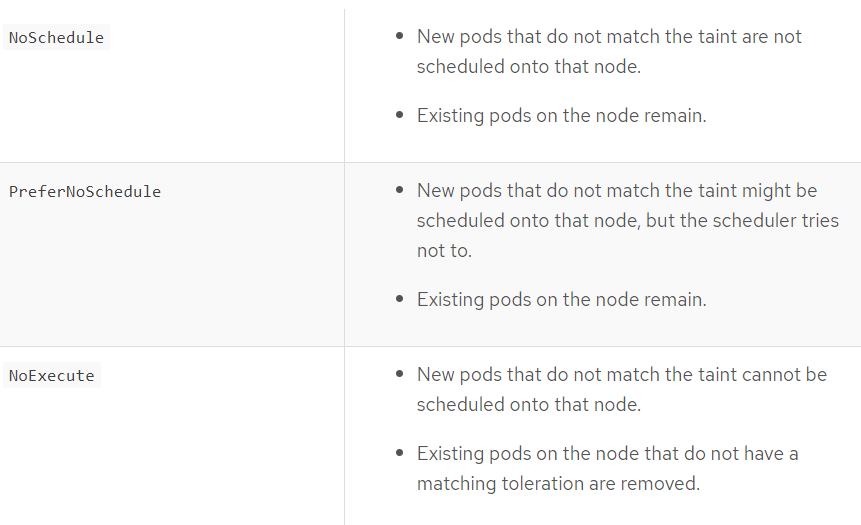 Taint-effect is the property of taint, how do we want to taint the node. We have 3 ways to do so, “NoSchedule”, “PreferNoSchedule”, “NoExecute”
