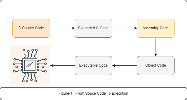 C is a language close to the heart of all low-level programming and the go-to language for embedded systems and OS design. The below Figure-1 highlights the trifecta and intermediate step for the execution of desired compute logic to dedicated hardware. C requires a compiler to convert the source to executable code. There are various compilers are available for C, However, we mostly will focus on GNU Compiler Collection or GCC. Also, if the targeted hardware (SoC/Embedded Chip – ARM/RISC based hardware) is different than the development machine (Laptop/PC – x86 based hardware) we would need a cross compiler. GCC-based cross-compilers are also available as freeware, usually provided by hardware vendors.