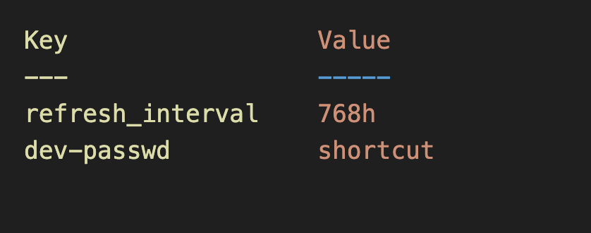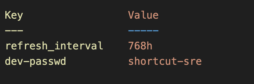 vault write kv/sre/passwords dev-passwd="shortcut-sre"